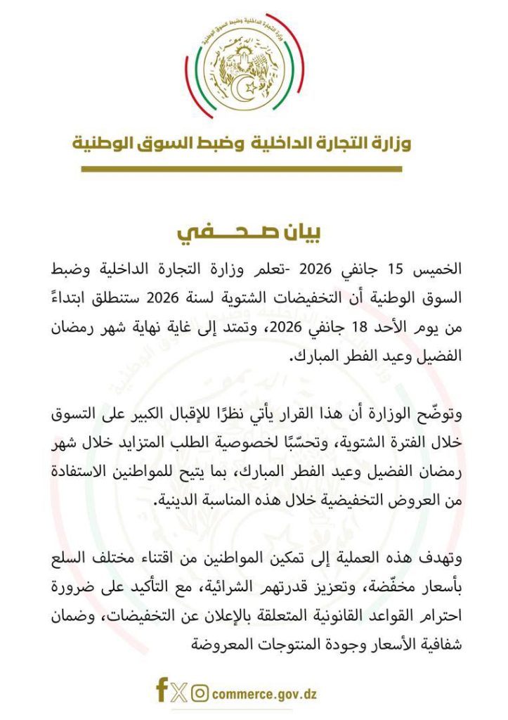 أعلنت وزارة التجارة الداخلية وضبط السوق الوطنية عن انطلاق التخفيضات الشتوية لسنة 2026 ابتداءً من يوم الأحد 18 جانفي 2026، على أن تمتد إلى غاية نهاية شهر رمضان الفضيل وعيد الفطر المبارك، في خطوة تهدف إلى تمكين المواطنين من الاستفادة من عروض واسعة بأسعار مخفضة