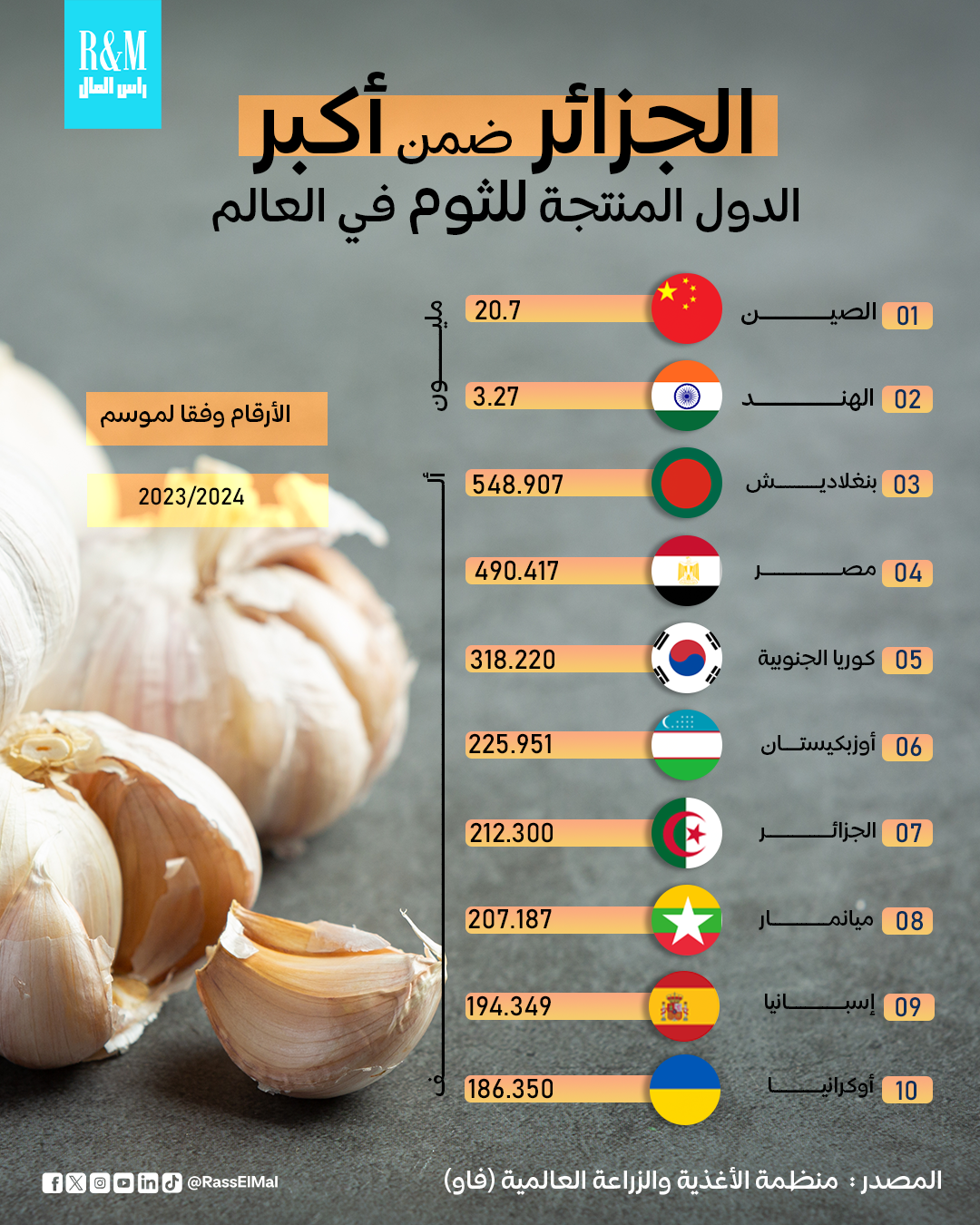 تتصدر الجزائر قائمة أكبر منتجي الثوم العرب، حيث أنتجت 212 ألفا و300 طن في موسم 2024/2023، لتحتل المرتبة السابعة عالمياً بين كبار المنتجين. وتتميز الجزائر بجودة إنتاجها وكفاءتها الزراعية، لتصبح لاعباً رئيسياً في الأسواق الإقليمية والدولية، إلى جانب مصر وسوريا وتونس والمغرب.