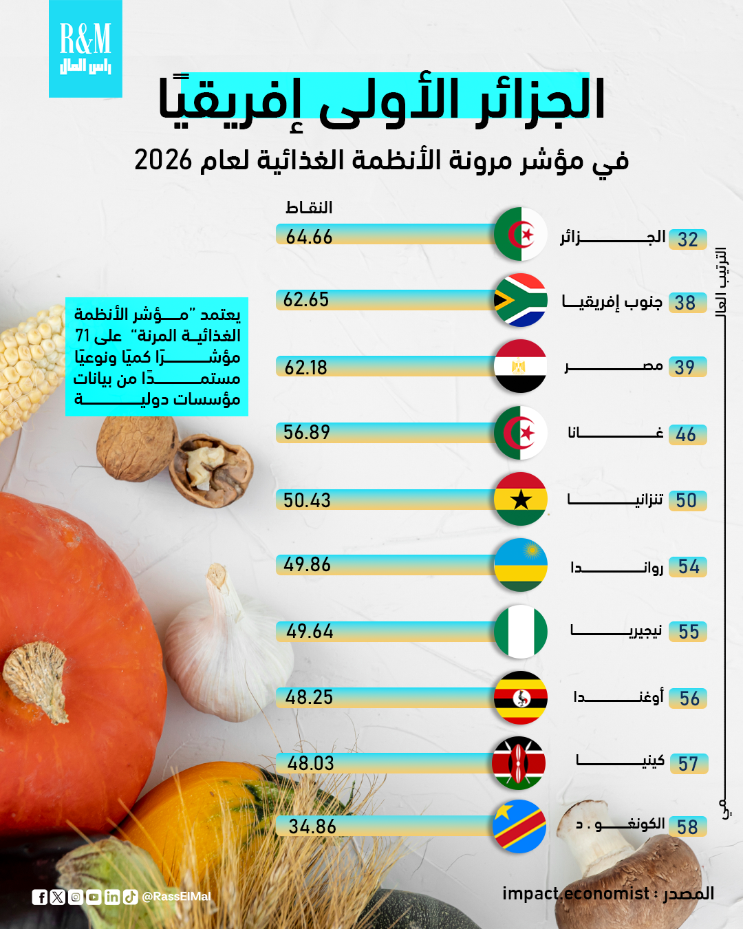 الجزائر تتصدر إفريقيا في مؤشر مرونة الأنظمة الغذائية 2026 بـ64.66 نقطة.. تحليل شامل لما تعنيه هذه النتيجة وتحديات الأمن الغذائي.