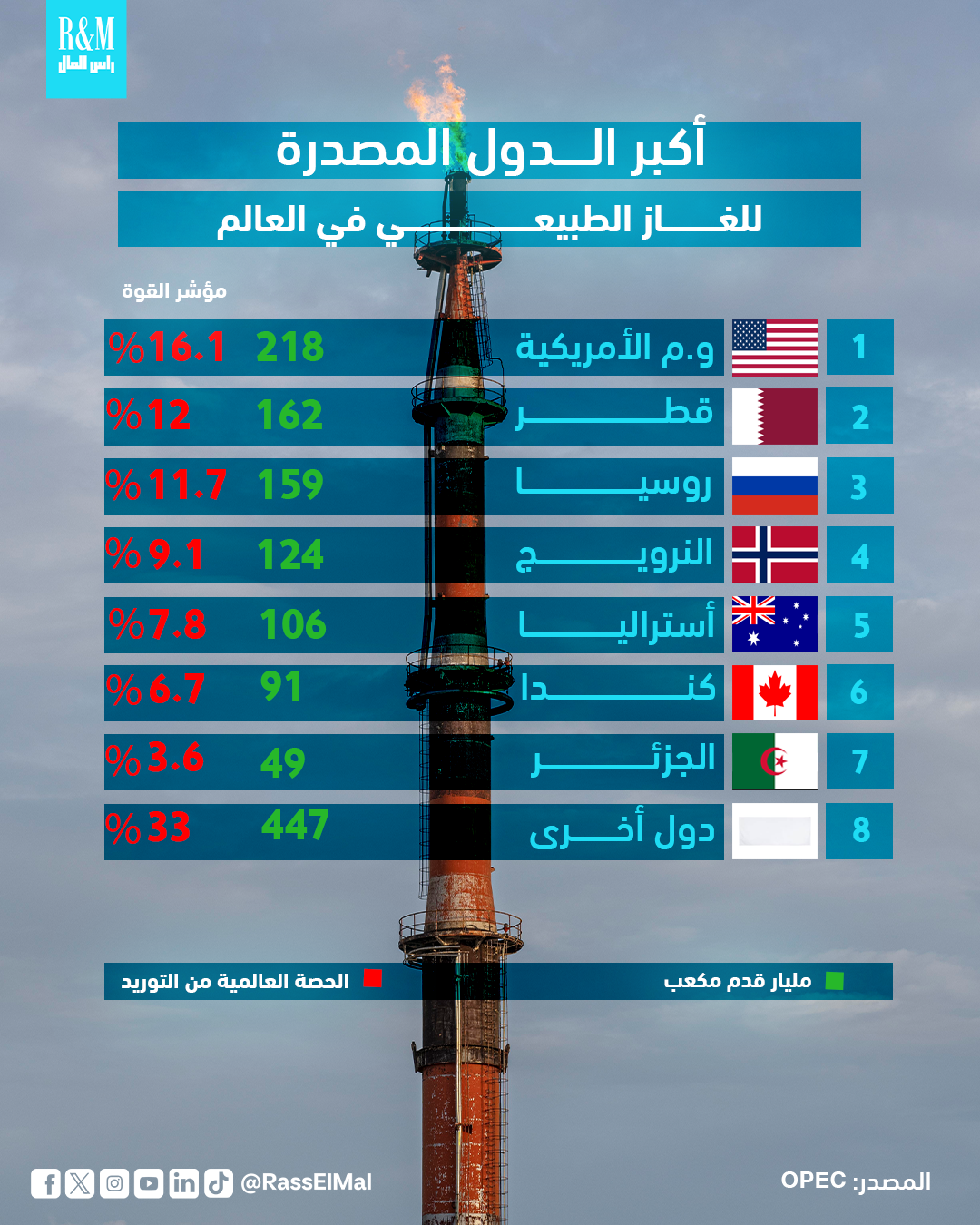 أظهرت أحدث البيانات التي ترصد مؤشر القوة في تصدير الغاز الطبيعي، استقرار الجزائر في المركز السابع عالمياً. الأرقام تتحدث بلغة القوة؛ حيث ضخت الجزائر 49 مليار قدم مكعب في شرايين الأسواق الدولية، لتستحوذ بثبات على 3.6% من إجمالي الحصة العالمية للتوريد.