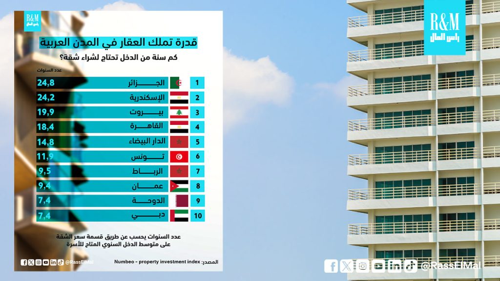 يُعدّ امتلاك السكن حلمًا وهدفًا أساسيًا لملايين الشباب والعائلات العربية. ومع تزايد التضخم وارتفاع أسعار العقارات، أصبح هذا الحلم يواجه تحديات غير مسبوقة. يسلّط “إنفوغراف راس المال” الجديد، المعتمد على بيانات Numbeo – Property Investment Index، الضوء على هذا الواقع من خلال مؤشر بسيط لكنه عميق: كم سنة من الدخل السنوي تحتاج الأسرة لشراء شقة […]