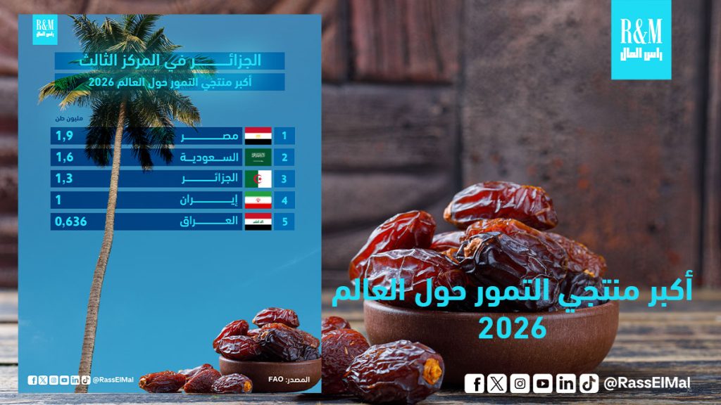 تواصل الجزائر تعزيز سيادتها الغذائية ومكانتها في الأسواق الدولية، حيث كشفت أحدث بيانات منظمة الأغذية والزراعة (FAO) لعام 2026 عن تربع الجزائر في المركز الثالث عالمياً ضمن قائمة كبار منتجي التمور، بمعدلات إنتاج تعكس طفرة حقيقية في قطاع الواحات. خريطة الإنتاج العالمي: المنافسة تشتعل في القمة تُظهر الأرقام المحققة هذا العام تحولاً ملموساً في موازين […]